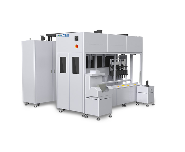 产品简介:该设备适用于大型方形铝壳电池的一次二次自动注液工艺,其注液主体采用专用夹具一次出八个电芯,多个模组协同作业布局结构,效率高,性能稳定。设备配备的称重系统,电池条码及重量数据可本地储存或上传MES系统。